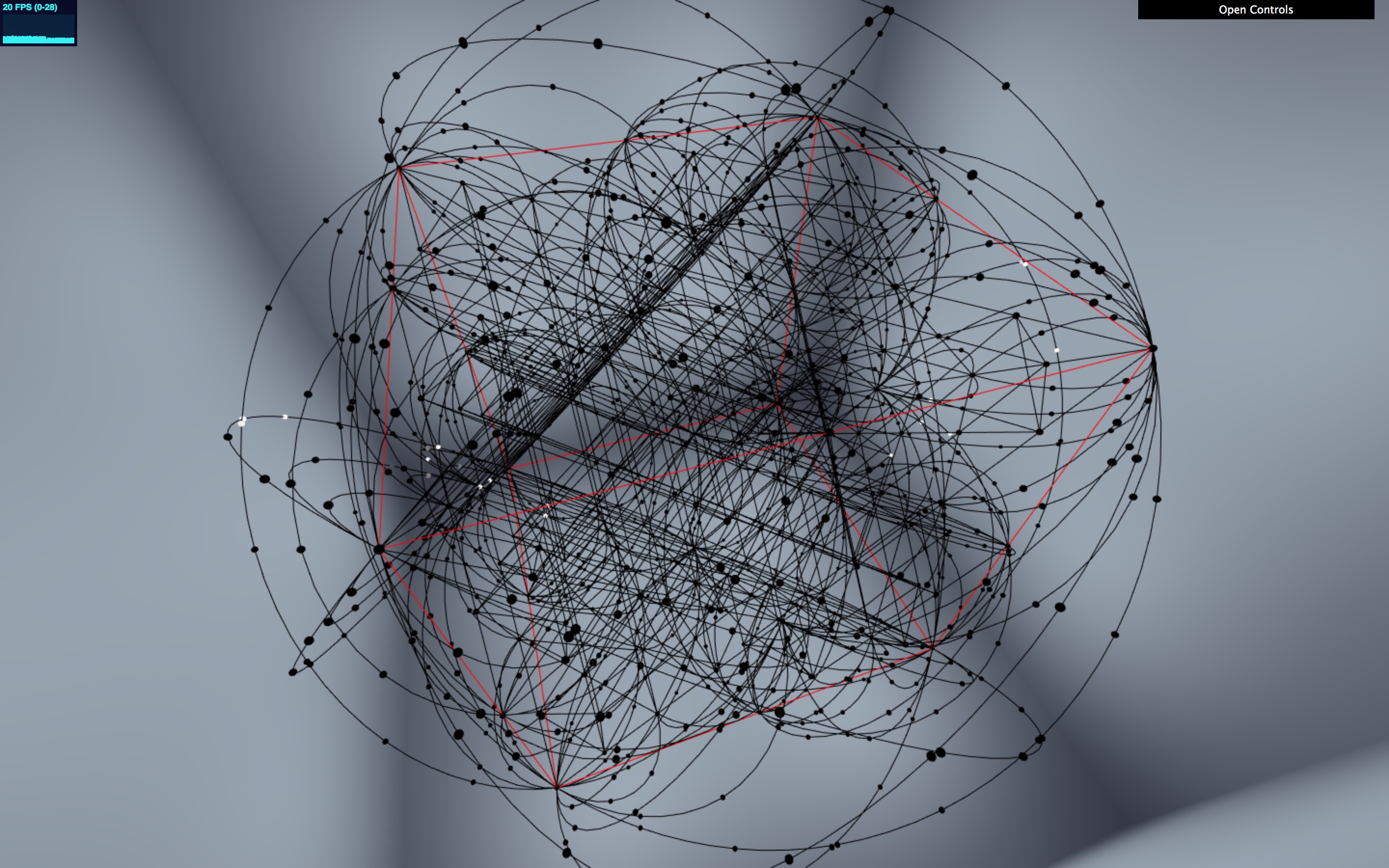 The Holohedron is a fixed, sparse, three-dimensional form that needs to be able to display a variety of phenomena, many of which don’t relate directly to the Holohedron shape. Some of the phenomena (blood flow) are three-dimensional, while others (ferromagnetism) are not. The central core of the Holohedron is formed of two regular tetrahedra, one of which is stellated (see the image above), but around this core there is a lot more detail in the form of circumscribed arcs at various scales, mapped out as in this image: