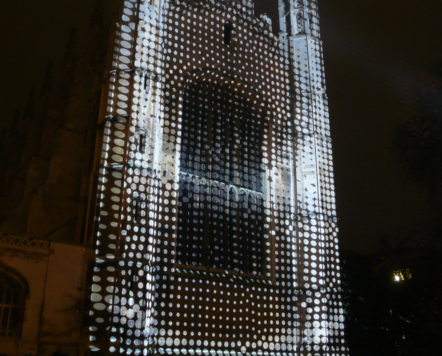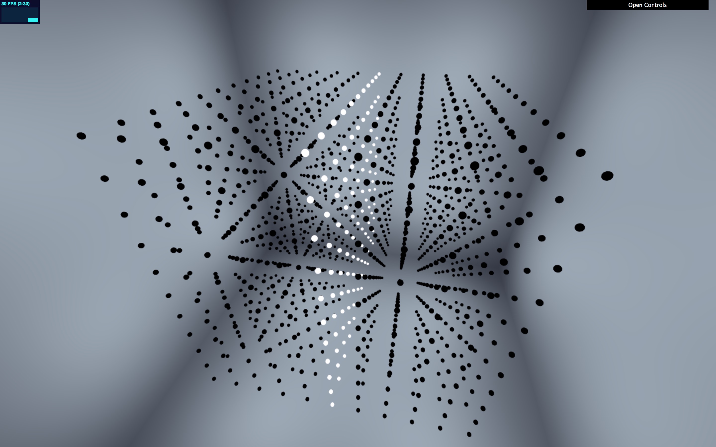 There’s a better, more general approach, informed by the way we built Plenum (although it’s a fairly obvious approach and has no doubt been used in digital art elsewhere: I refer the interested reader to scalar fields). Any displayed pattern on a canvas of discrete points is implemented as a function from a point’s position to the displayed value. In the image below, the display function maps point position \( (x, y) \) to point size, so even though the points are arranged irregularly, and are constantly moving, visual artifacts like the concentric rings remain in a stable position: